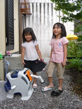 それこそ、先日点検で行った宮崎市内のMさんのちの、ユウナちゃん&ミサキちゃんも、庭のホースを使って水遊びしてました