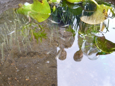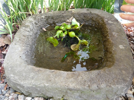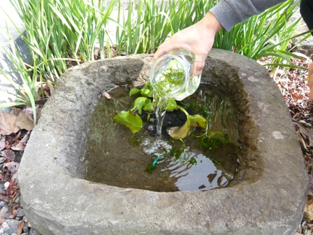 玄関先にある、灰石の器に水を張り・水草を浮かべ・メダカを投入