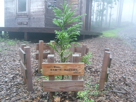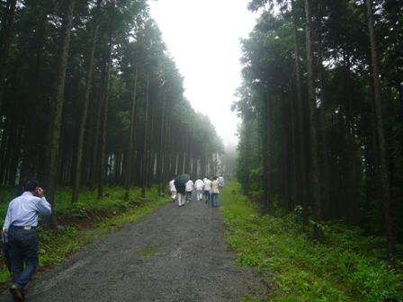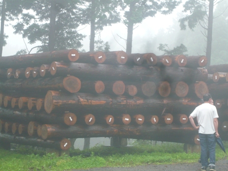 今度は歩いて山道を登ります。登りきった所は切り出された木材が井桁に組み上げられられている『護持の森』というとても広い森でした。