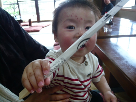 いっちょまえに箸を持ち、