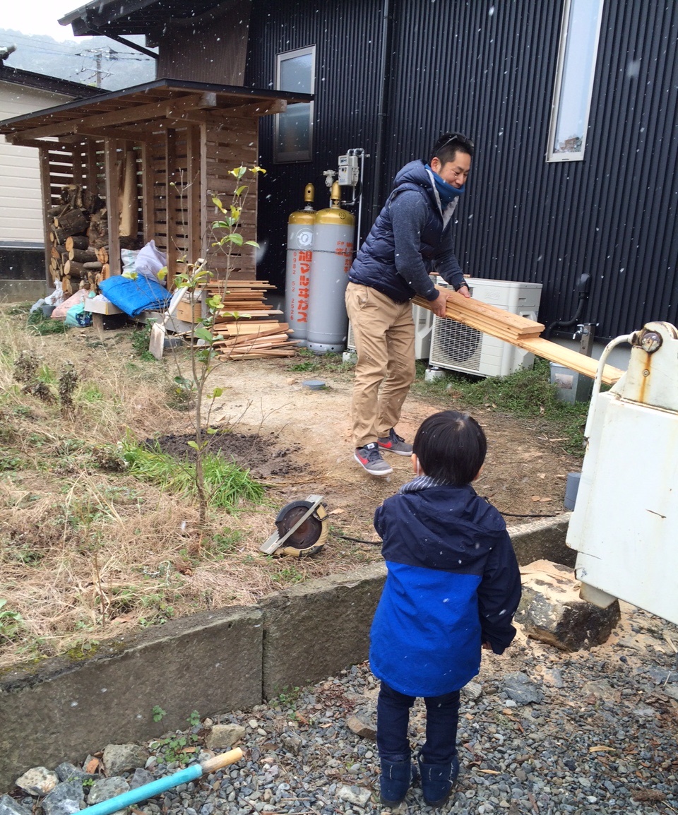 雪降る中、薪をこしらえる叔父を見守る甥っ子。