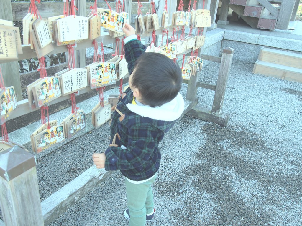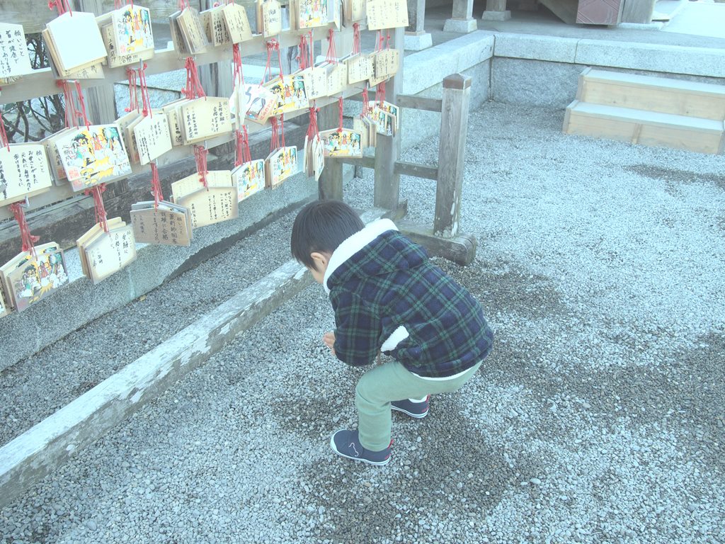そんな中お兄ちゃんは絵馬札の前で弟の成長を神様にお願い。
