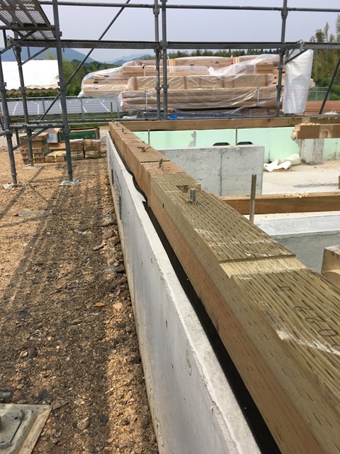 基礎の上に土台という柱を立てる為の木材を敷いていく作業、弊社では基礎と土台の間にスポンジ状のテープを貼り、外部からの隙間風が屋内に入らないようにひと手間加えています。