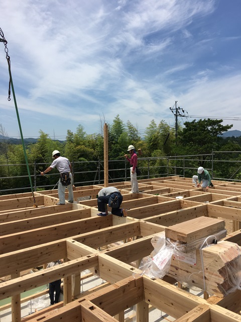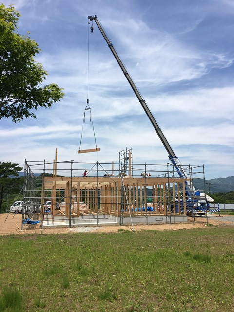柱・梁桁などの構造材をクレーン車を使い組立てていく日、二次元だったマイホームが三次元になり感動する瞬間。僕たちにとっても緊張の1日。