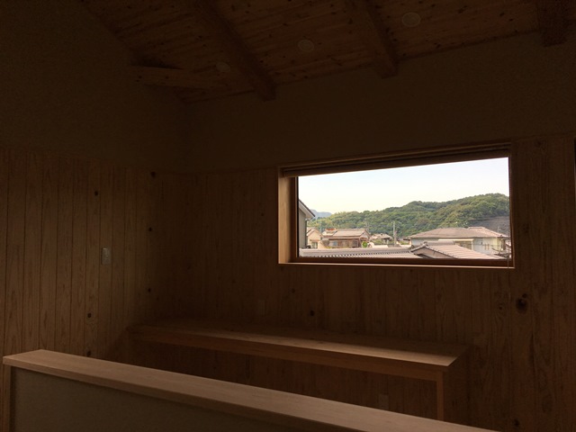二手に分かれた階段ホールを、北へ行くと御主人の書斎コーナーがあり窓からは裏山の景色が綺麗に見渡せます。