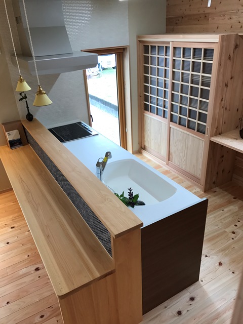14年前に弊社が施工させて頂いた、御友人宅を参考にリビングには掘りごたつを設け、忙しい朝の朝食や宿題などは、調理している家族に近いカウンターも使えます。