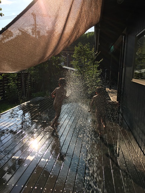 プールの始まった息子達は、さっそく庭で水遊び♪