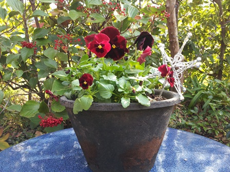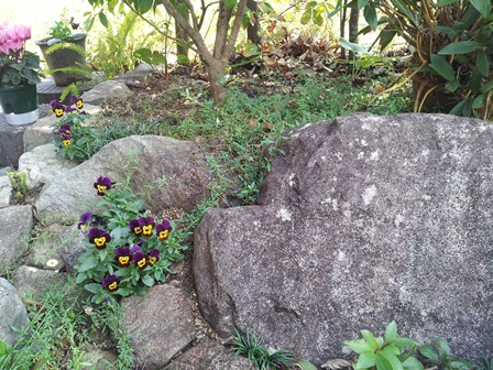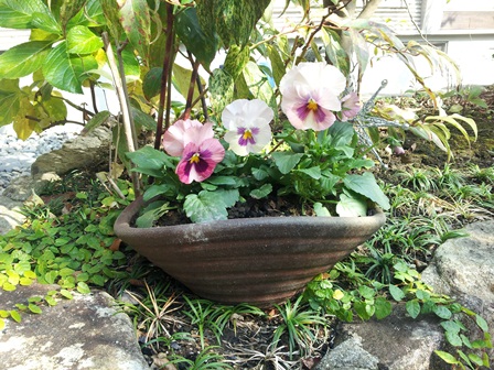 玄関先のビオラたちが「おかえりなさい」とこちらに顔を向け