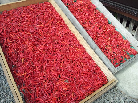 色の輝きと香りに誘われて冷たい風が唐辛子を乾燥へと導いています。