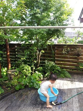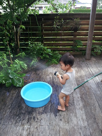 ちびすけくんはお庭に水を撒くふりをしながら水遊びを楽しんでいる模様です。